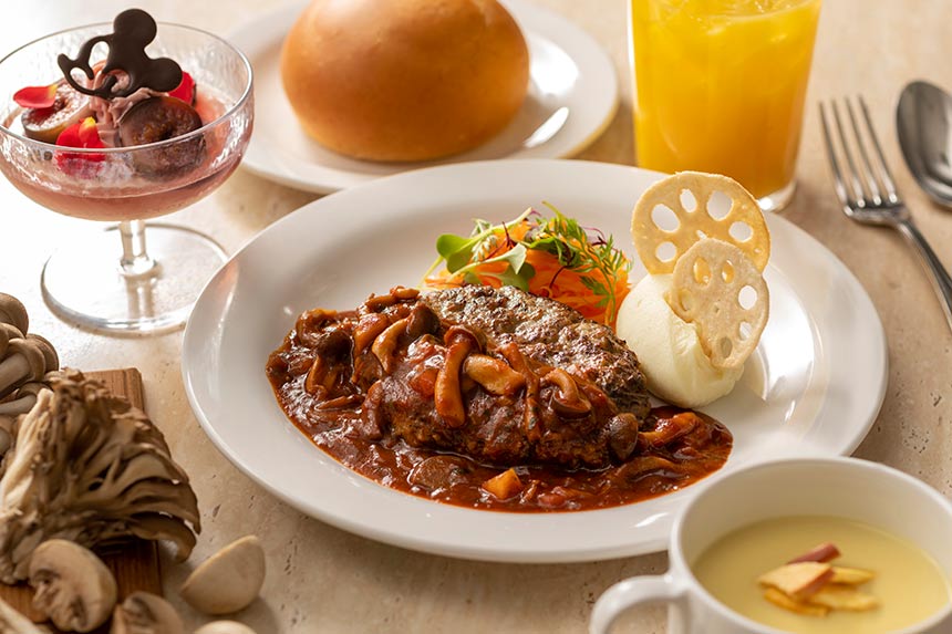 時空を超えた未来のマリーナ、ポートディズカバリ―で、世界中からやって来たゲストをもてなすレストラン「ホライズンベイ・レストラン」では、まいたけ、しめじ、マッシュルームなど、きのこがたっぷりの濃厚なソースをハンバーグにかけた、大人から子供まで楽しめるスペシャルセットになっています。