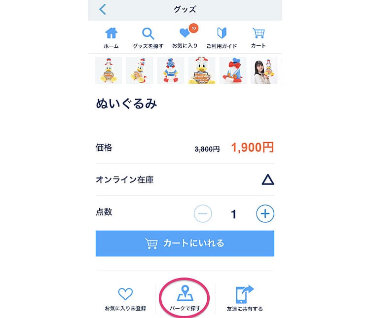 気になるグッズがあったら、「パークで探す」というところを見てみてください。
