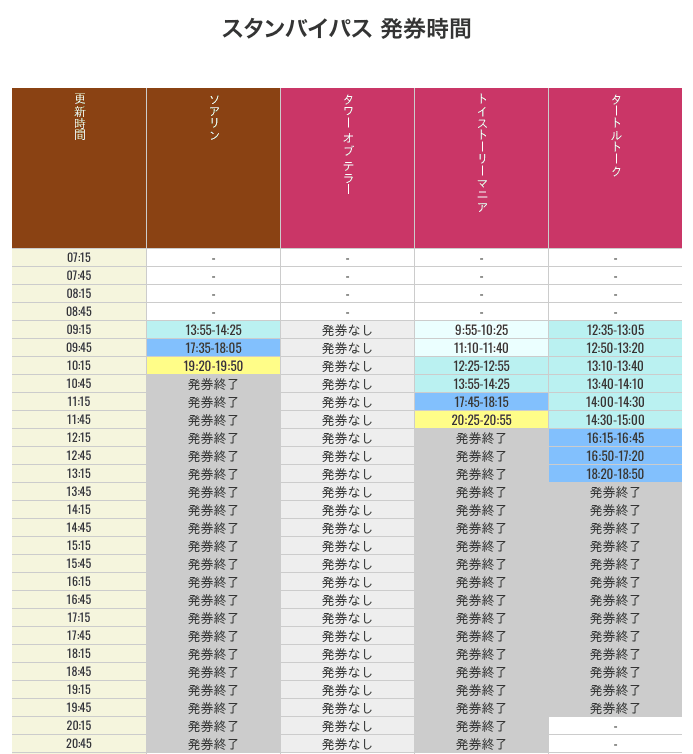 ディズニーリアルのサイトでも過去のスタンバイパスの状況がわかりますので、しっかり予定を立てたい方は直近の分をチェックするといいと思います!