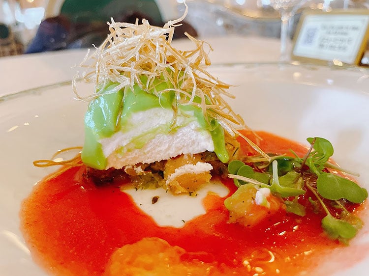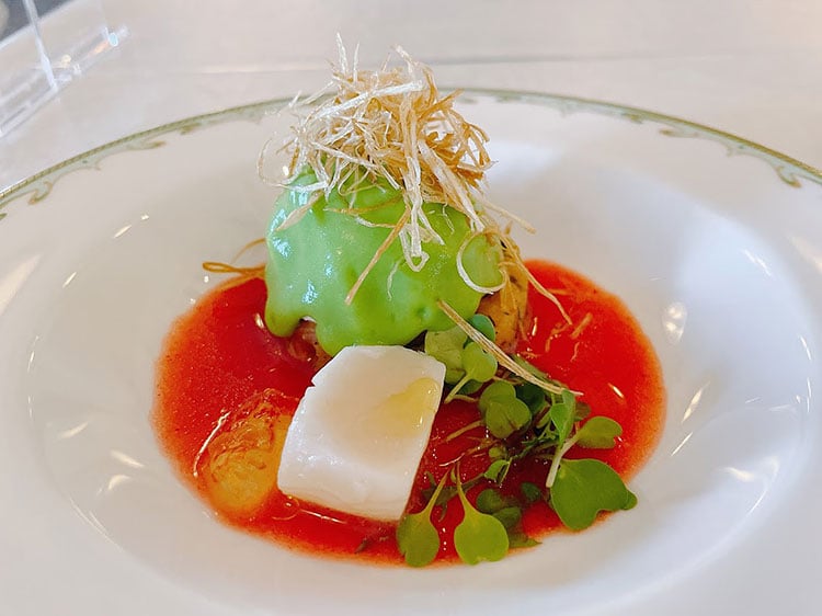トマトコンソメジュレとホタテが添えられ、彩りも良く、色々な味が楽しめる一皿ですね♪