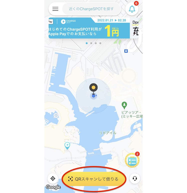 ②「ChargeSPOT」のアプリを起動し、レンタルスタンドに記載されているQRをスキャンする