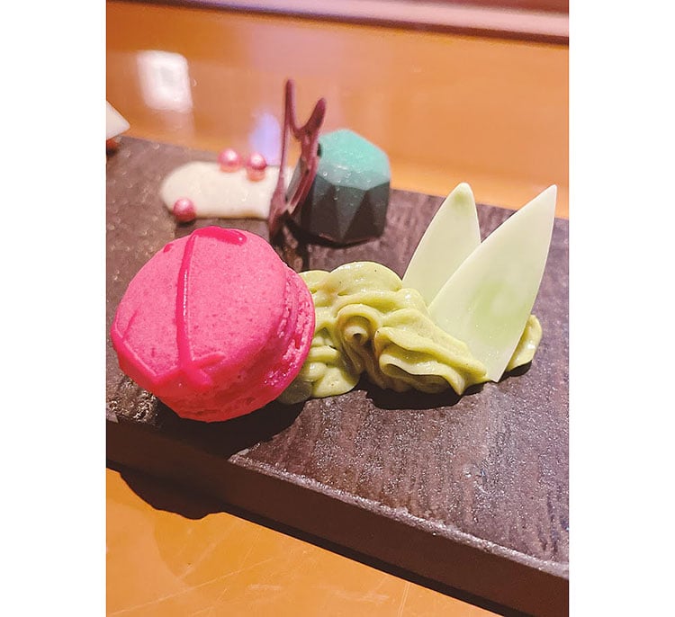 ラズベリーのマカロンとピスタチオのクリームでアリエルをイメージしています。