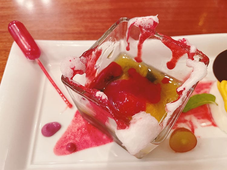 酸味のあるベリーソースを綿あめにかけて溶かしていただくという発想にもびっくりです。