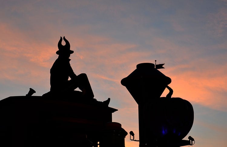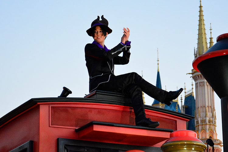 ウエスタンリバー鉄道をイメージした先頭のフロートには、『眠れる森の美女』のヴィランズ、マレフィセントの手下であるマルフィが乗っています。