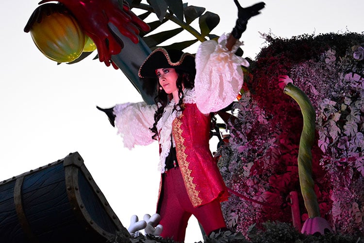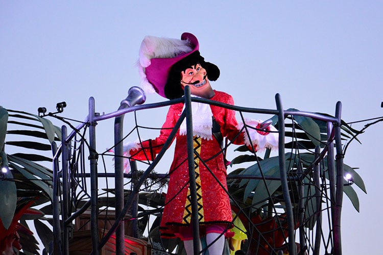 アドベンチャーランドをイメージした2台目のフロートには、前方に『ピーター・パン』のフック船長が乗っています。