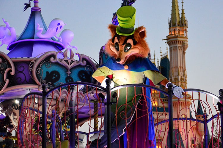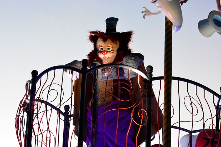 ファンタジーランドをイメージした4台目のフロートには、『ピノキオ』のファウルフェローが乗っています。