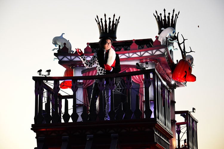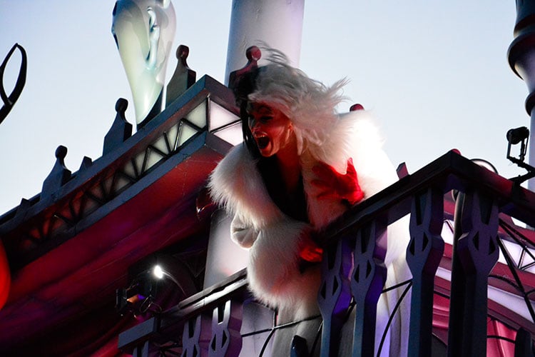 カントリーベアシアターと蒸気船マークトゥエイン号をイメージした5台目のフロートには、『101匹わんちゃん』のクルエラ・ド・ビルが乗っています。