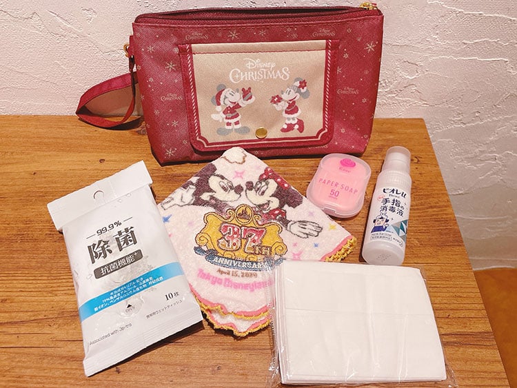 反対側の仕切りには、ハンカチ、ティッシュ、アルコールスプレー、紙石鹸(公園の水道や舞浜駅改札内のお手洗いには石鹸がない・・・!)を入れておきました。