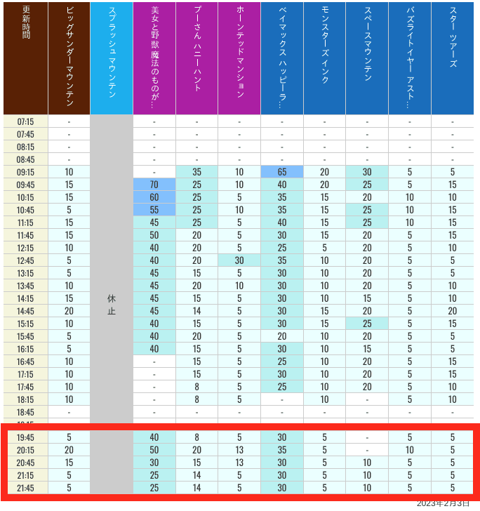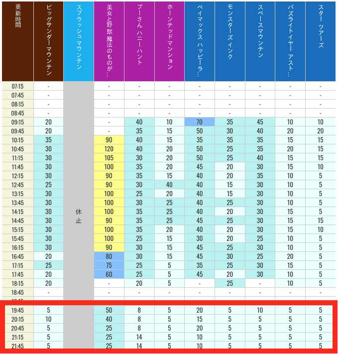 また、人気アトラクションの美女と野獣、ベイマックも日中の半分以下!