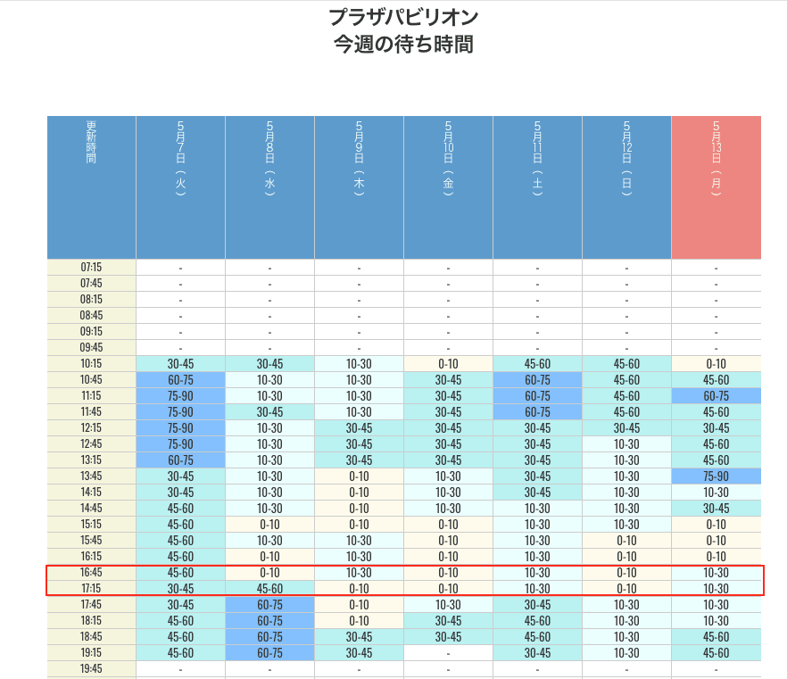 ディズニーリアルで過去一週間の待ち時間を見てみましょう。