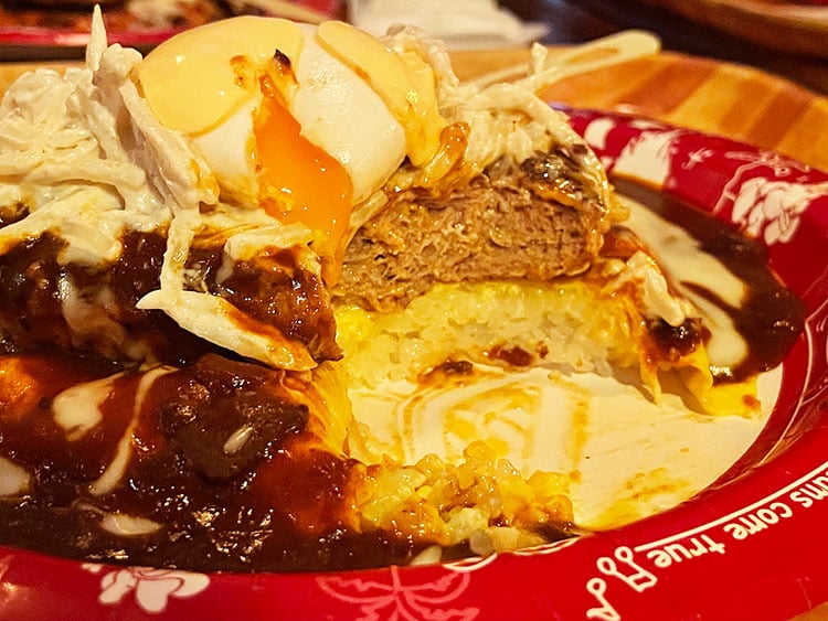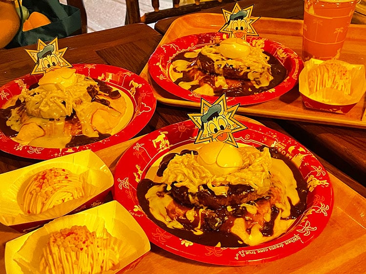 そこにたっぷりのハッシュドビーフと、ドナルドのお尻のような半熟卵、足形のチーズがトッピングされています。