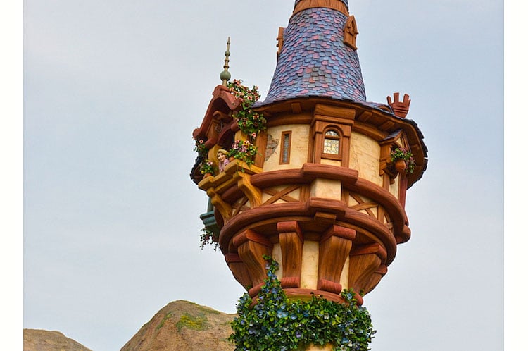 ラプンツェルの塔はアトラクションに乗らなくても見ることができるのですが、エリアを進んで行って塔が見えた時の感動ったらもう・・・!!