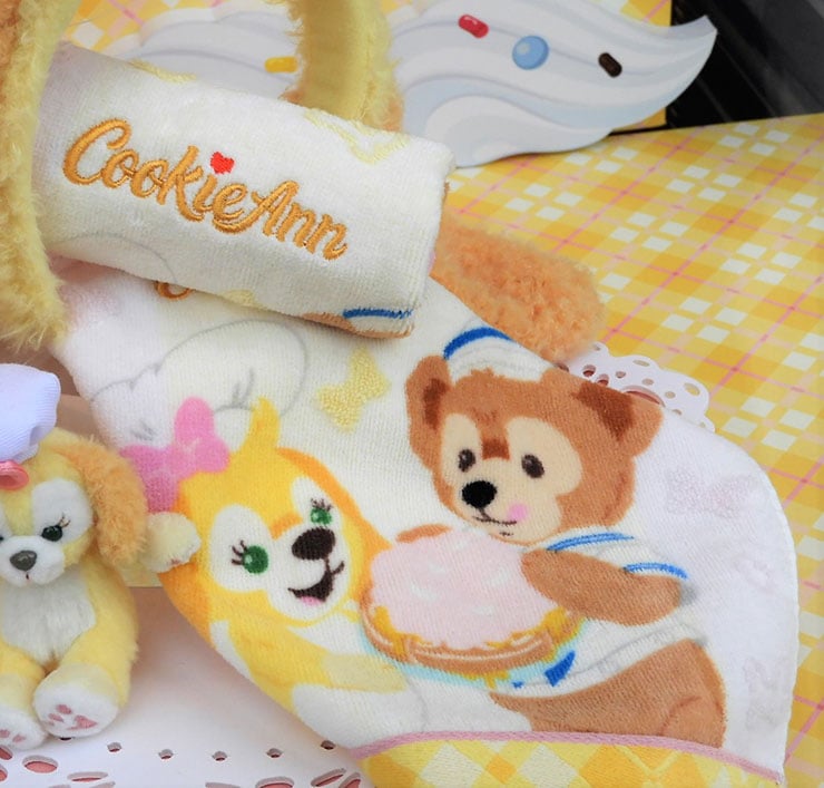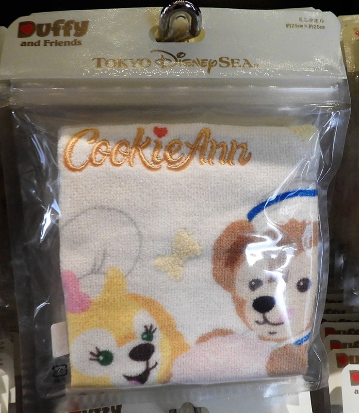 ダッフィーとクッキーアンの出会いが描かれたミニタオル。