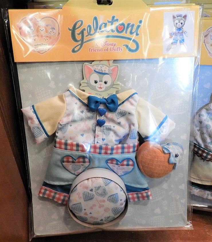 エプロンのポケットにはダッフィー、シェリーメイ、ジェラトーニ、ステラルー、クッキーアン5人の総柄がプリントされています。