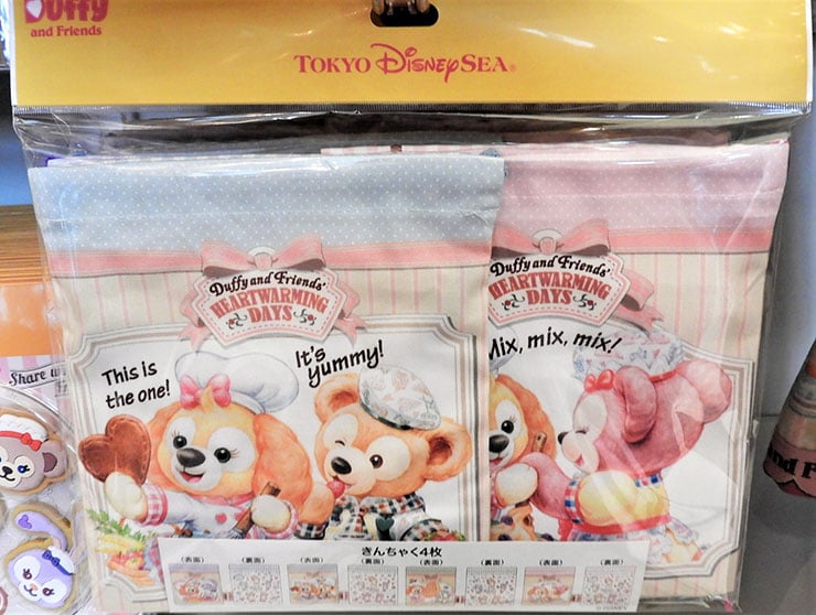クッキーアンとワッフルづくりを楽しむ、ダッフィー、シェリーメイ、ジェラトーニ、ステラルーの様子が描かれたきんちゃくセット。