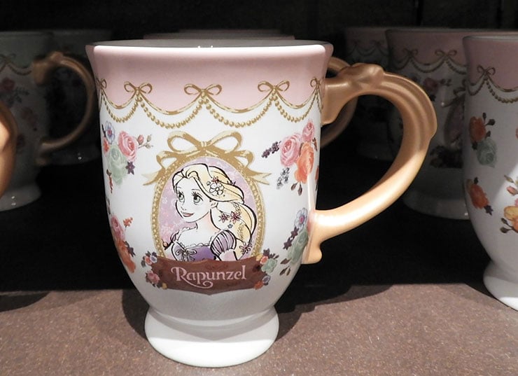 リボンと花がたくさんあしらわれたラプンツェルのマグカップ。